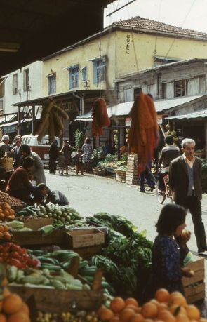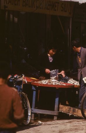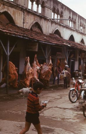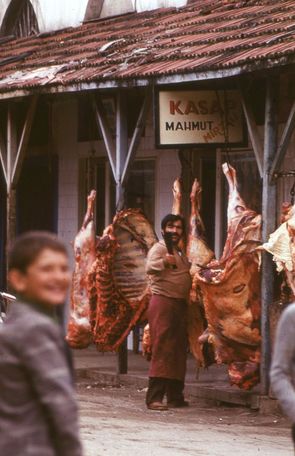 Gerne hätte dieser Fleischer uns etwas von seiner Ware verkauft. Davon machten wir aber kein Gebrauch, trotz des Sonderangebots seiner tierischen Köstlichkeiten. Für uns Seeleute waren Bullenhoden als Spezialität eben mehr als nur gewöhnungsbedürftig. Normalerweise hätte dieser Fleischer nach unserer Beobachtung drei Arme haben müssen. Es war schon artistisch, wie er ein Fleischklumpen beachtlicher Grösse aus der Rinderhälfte heraus schnitt, fast gleichzeitig in eine Zeitung wickelte und Schwärme schillernder Fliegen durch sein fixes Hantieren dabei vertrieb. Nicht weit genug, denn der nahegelegenste rosige Fleischfetzen war sofort der neue Landeplatz. Zum Glück schlachtete er hier auf dem Basar nicht selbst, so wie es auf anderen orientalischen Basaren damals üblich war.