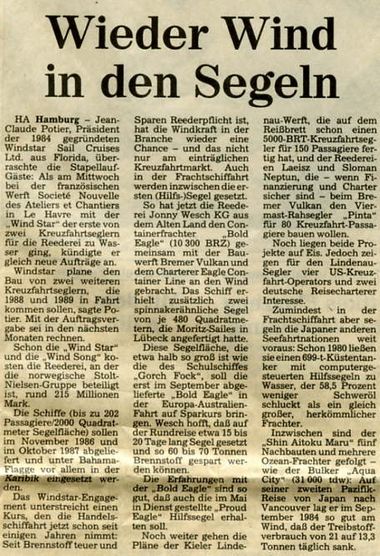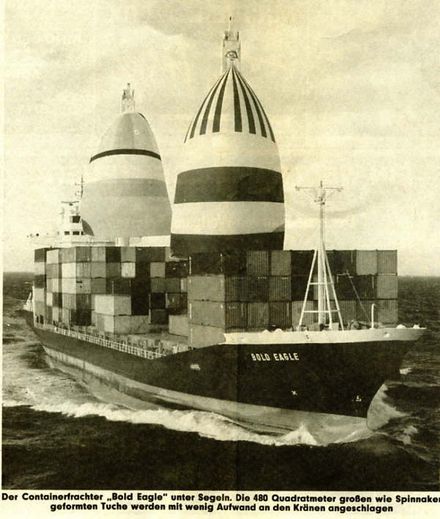 Begonnen hatte alles im September des Jahres 1985,als die Reederei Wesch den in der Bundesrepublik bisher einmaligen Versuch unternahm, Maschinen- und Segelantrieb zu verbinden. Bei der "Bremer Vulkanwerft" wurde der Containerfrachter "Bold Eagle" dafür umgerüstet. Das 10 300 BRT verdrängende Schiff, daß eine 7000 PS starke Maschine besaß, wurde mit zwei Großsegeln mit je 480 Quadratmeter Größe ausgestattet.Sinn und Zweck sollte es sein, bei geeigneten Windverhältnissen mit gehißten Segeln, bei gedrosselter Maschine, die vorgegebene Reisegeschwindigkeit beizubehalten. Bei der regelmässigen Route des Schiffes zwischen Europa(Hamburg) und Australien (Melbourne), erhoffte man sich bei der 20 tägigen Reise beachtliche Treibstoffeinsparungen.